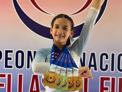 La joven gimnasta Coral Victoria Caamaño Mateo se coronó campeona nacional de gimnasia artística femenina nivel 6 durante el Campeonato Nacional Estrellas del Futuro, celebrado por la Federación Dominicana de Gimnasia (Fedogim).