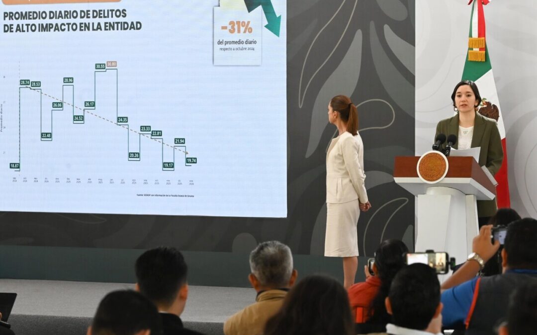 De acuerdo con las cifras oficiales, los homicidios dolosos pasaron de 4.74 víctimas al día en enero del año pasado a 3.42 en el primer mes de este año. En la conferencia matutina de la presidenta Claudia Sheinbaum, realizada en Sinaloa, la funcionaria afirmó que desde hace seis meses hay una estabilidad en la violencia, la cual repuntó en septiembre de 2024 por una disputa entre los grupos de “Los Chapitos” y “Los Mayitos”, facciones del Cártel de Sinaloa. “A partir de septiembre, por una pugna entre dos grupos de la delincuencia organizada, incrementa la violencia en el estado a 4.77 homicidios diario promedio. Gracias al reforzamiento de la estrategia de seguridad en el estado hay una disminución durante los primeros meses, después hubo un repunte en junio de 2025 que llegó a 6.9 homicidios promedio diario, y a partir de ahí nuevamente, como se ve claramente en la gráfica, la tendencia también va a la baja, promediando este enero de 2026, 3.42 homicidios”, indicó. Aunque en los homicidios ha habido una disminución, las lesiones dolosas por disparo de arma de fuego pasaron de 0.97 de enero de 2025 a 1.32 a enero de 2026. El delito de robo de vehículo también tuvo un repunte como parte de la disputa de las facciones, pero ya se logró una disminución. “Este delito también tuvo un repunte importante, también por las mismas razones que incrementa el homicidio a partir de septiembre de 2024, aunque ha tenido algunas fluctuaciones, también vemos una tendencia, ya en los últimos meses, a la baja y esta reducción representa un 20%, menos en el robo de vehículo en la entidad de forma mensual, esto es comparando octubre de 2024 con enero de 2026”, explicó.