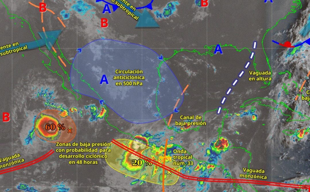 El SMN detalla que una zona de baja presión con probabilidad para desarrollo ciclónico frente a las costas de Oaxaca, interaccionará con la onda tropical núm. 33 que se desplazará sobre el sur y gradualmente sobre el centro del país, con una vaguada en altura sobre el sureste del Golfo de México, con inestabilidad atmosférica y con el ingreso de humedad del Golfo de México y mar Caribe, lo cual originará lluvias puntuales intensas acompañadas con descargas eléctricas en Oaxaca, Chiapas, Tabasco y Veracruz, además de lluvias fuertes a muy fuertes en Guerrero, Campeche, Yucatán y Quintana Roo. El monzón mexicano en combinación con inestabilidad atmosférica, ocasionará lluvias fuertes a muy fuertes en Sonora, Chihuahua, Durango, Sinaloa y Nayarit. Otra zona de baja presión con probabilidad para desarrollo ciclónico al suroeste de Baja California Sur, ocasionará lluvias fuertes en dicho estado, así como rachas de viento de 30 a 50 km/h y oleaje de 1.5 a 2.5 metros de altura en sus costas. Asimismo, un canal de baja presión en el noreste y oriente del territorio nacional y el ingreso de humedad del golfo de México, originarán chubascos y lluvias fuertes con descargas eléctricas en dichas regiones, con lluvias puntuales muy fuertes en Puebla. Simultáneamente, el ingreso de humedad del golfo de México y océano Pacífico, provocará chubascos y lluvias fuertes en el occidente y centro de la República Mexicana, además de lluvias puntuales muy fuertes en Jalisco y Michoacán. «Las precipitaciones podrían generar deslaves, incremento en niveles de ríos y arroyos, así como desbordamientos e inundaciones en zonas bajas de los estados mencionados, por lo que se exhorta a la población a atender los avisos del SMN y seguir las recomendaciones de Protección Civil», recuerda el organismo dependiente de la Conagua.