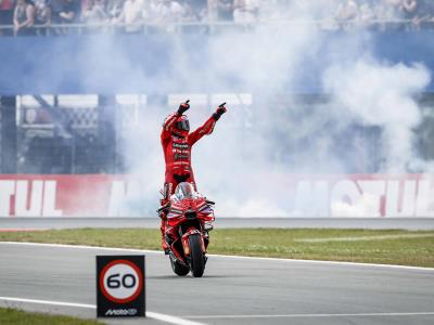 En la «Catedral» del motociclismo de Assen, que celebraba este domingo el centésimo aniversario de una carrera de categoría reina, Márquez subió a lo más alto del podio, escoltado por los italianos Marco Bezzechi (Aprilia), 2º, y su compañero Francesco Bagnaia (Ducati), 3º.