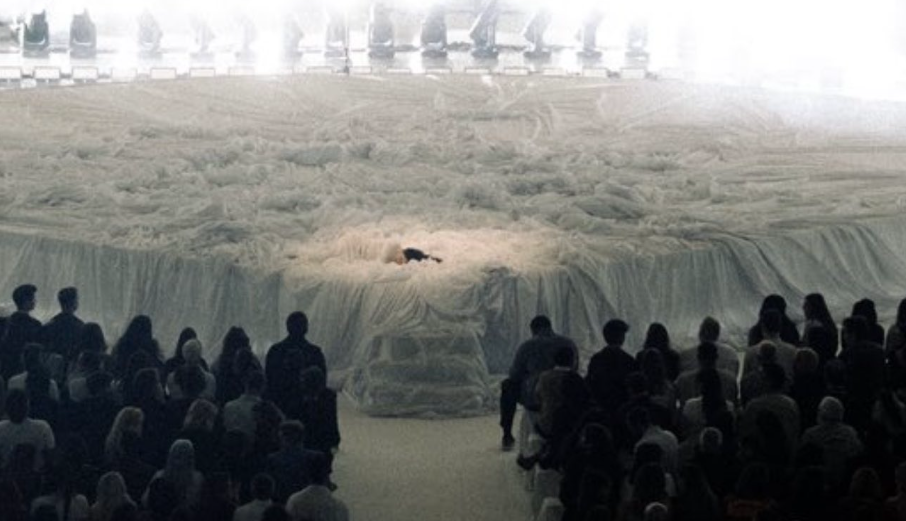 Desde las gradas superiores, la sala Oval del Museu Nacional de Catalunya parece el funeral de un tipo estridente. Los bancos están ocupados por trajes negros –el código de vestimenta exige un ‘chic attire’– y al fondo hay un altar lleno de sábanas blancas arrugadas, entre las que contrasta una cabellera oscura. Un poco más allá, unos focos ciegan la imagen.
