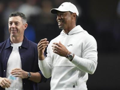 Hubo momentos clásicos de Woods, como observar fijamente los tiros que le gustaban mientras los tableros de video de alta tecnología describían la trayectoria que la bola habría seguido al aire libre. También hubo momentos frustrantes: meneó la cabeza después de enviar un wedge de 101 yardas al agua en el segundo hoyo del partido de 15 hoyos — mientras su hijo Charlie, sentado en una de las butacas del estadio con vista al campo, no pudo evitar la risa.